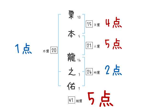 人運![]() | 栗本龍之佑さんの人運は21画の5つ星!統率力がある。独立し成功する。名誉を手に入れる。 性格や才能などを表す2番目に重要な運勢です。人間関係や協調性、社会的な成功に影響します。主に20歳から50歳ぐらいまでの中年期の運勢を表します。 |