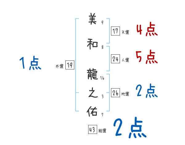 地運![]() | 美和龍之佑さんの地運は26画の2つ星!波瀾万丈かも。信頼できる人を大事にしましょう。 個性を表す基礎的な運勢です。性格形成や対人関係、行動力など家庭環境に影響されます。主に誕生してから20歳くらいまでの若年期の運勢を表します。 |