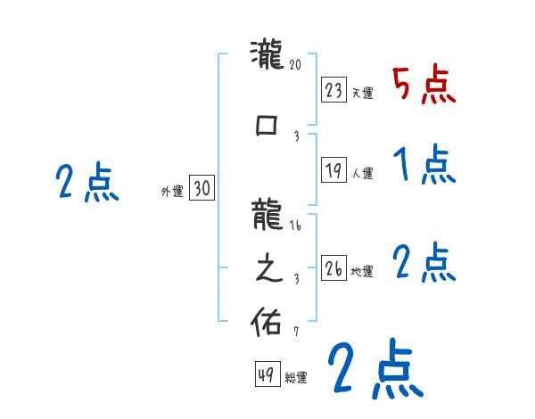 天運![]() | 瀧口龍之佑さんの天運は23画の5つ星!想像力に優れ活力がある。一代で成功し名誉を手に入れる。 家系が持つ宿命的な運勢を表します。祖先から受け継いだ苗字ですので自分の力が及びません。家柄を象徴します。 |