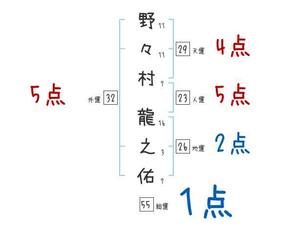天運![]() | 野々村龍之佑さんの天運は29画の4つ星!完全主義で才能がある。厳格な心の持ち主。 家系が持つ宿命的な運勢を表します。祖先から受け継いだ苗字ですので自分の力が及びません。家柄を象徴します。 |