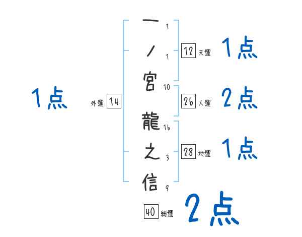 地運![]() | 一ノ宮龍之信さんの地運は28画の1つ星!家庭環境に注意。スポーツで活躍できる能力があるかも。 個性を表す基礎的な運勢です。性格形成や対人関係、行動力など家庭環境に影響されます。主に誕生してから20歳くらいまでの若年期の運勢を表します。 |