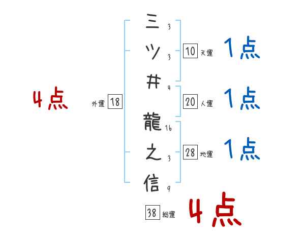 外運![]() | 三ツ井龍之信さんの外運は18画の4つ星!情熱的で剛気。忍耐力があり信頼される。 生活面を象徴する運勢です。外部から受ける影響力を表し、結婚運、家庭運や職場、環境への順応性を表します。 |
