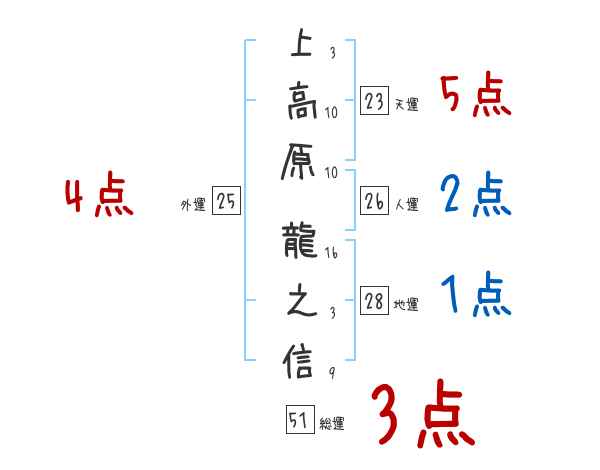 天運![]() | 上高原龍之信さんの天運は23画の5つ星!想像力に優れ活力がある。一代で成功し名誉を手に入れる。 家系が持つ宿命的な運勢を表します。祖先から受け継いだ苗字ですので自分の力が及びません。家柄を象徴します。 |