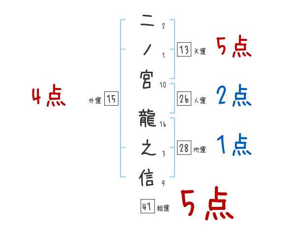 外運![]() | 二ノ宮龍之信さんの外運は15画の4つ星!人徳があり出世する。順調に物事を進め円満な人生。 生活面を象徴する運勢です。外部から受ける影響力を表し、結婚運、家庭運や職場、環境への順応性を表します。 |