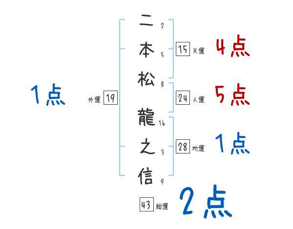 総運![]() | 二本松龍之信さんの総運は43画の2つ星!頑固な性格で独立心が強いかも。やや非現実的で浪費に注意しましょう。 あなたの人生を表す1番重要な運勢です。生涯を通じて影響する総合運となり、主に50歳以降の晩年期に影響を及ぼします。 |