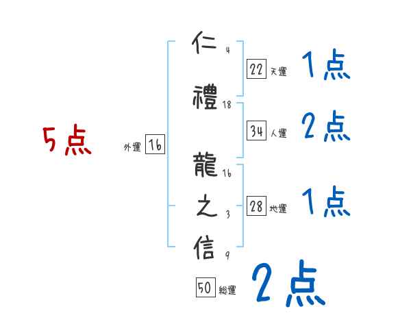 外運![]() | 仁禮龍之信さんの外運は16画の5つ星!人望が厚く大きく発展する。逆転成功が見える。 生活面を象徴する運勢です。外部から受ける影響力を表し、結婚運、家庭運や職場、環境への順応性を表します。 |