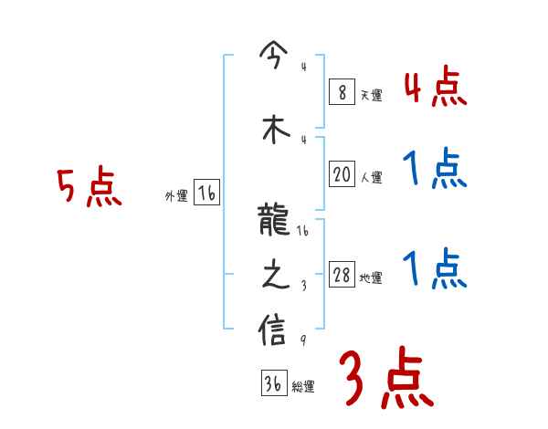 総運![]() | 今木龍之信さんの総運は36画の3つ星!先見性が豊かです。多少神経質で苦労することも。 あなたの人生を表す1番重要な運勢です。生涯を通じて影響する総合運となり、主に50歳以降の晩年期に影響を及ぼします。 |