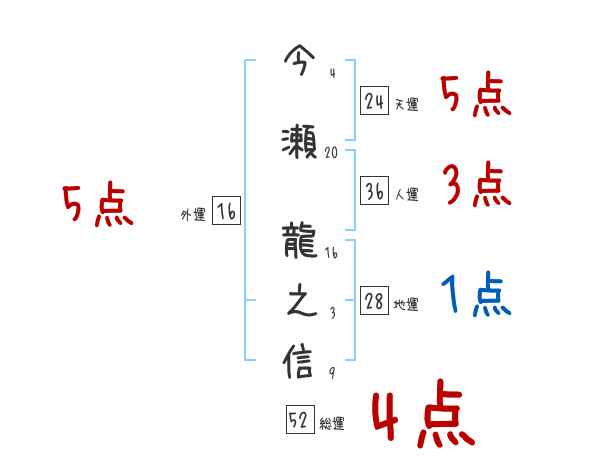 外運![]() | 今瀬龍之信さんの外運は16画の5つ星!人望が厚く大きく発展する。逆転成功が見える。 生活面を象徴する運勢です。外部から受ける影響力を表し、結婚運、家庭運や職場、環境への順応性を表します。 |