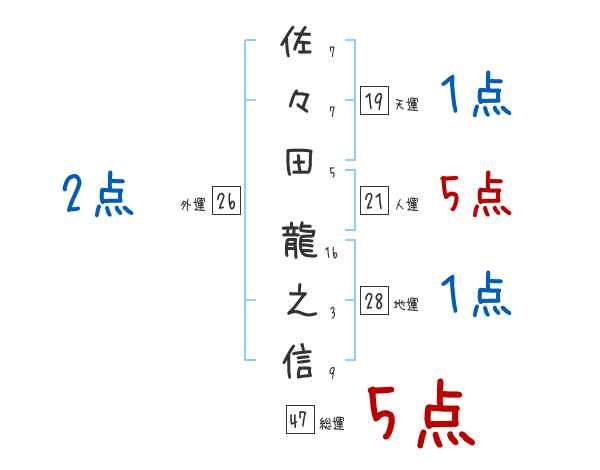 総運![]() | 佐々田龍之信さんの総運は47画の5つ星!実力が開花し発展する円満な人生。財に恵まれる。 あなたの人生を表す1番重要な運勢です。生涯を通じて影響する総合運となり、主に50歳以降の晩年期に影響を及ぼします。 |