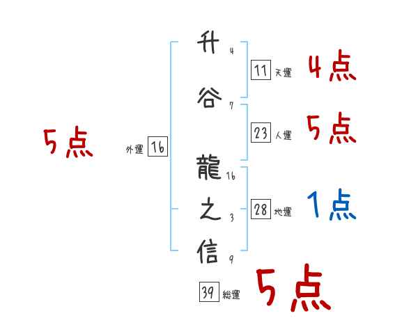 天運![]() | 升谷龍之信さんの天運は11画の4つ星!着実に富や地位を得る幸運な人生。 家系が持つ宿命的な運勢を表します。祖先から受け継いだ苗字ですので自分の力が及びません。家柄を象徴します。 |