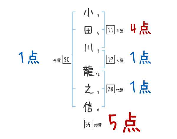 天運![]() | 小田川龍之信さんの天運は11画の4つ星!着実に富や地位を得る幸運な人生。 家系が持つ宿命的な運勢を表します。祖先から受け継いだ苗字ですので自分の力が及びません。家柄を象徴します。 |