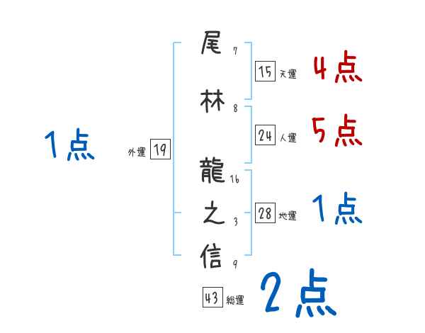 外運![]() | 尾林龍之信さんの外運は19画の1つ星!優れた才能を持ちますが、協調性が足りないことも。周りの人と協力する事を意識しましょう。 生活面を象徴する運勢です。外部から受ける影響力を表し、結婚運、家庭運や職場、環境への順応性を表します。 |