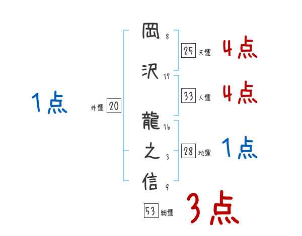 総運![]() | 岡沢龍之信さんの総運は53画の3つ星!やや見栄っ張りで虚栄心がある。散財に注意。 あなたの人生を表す1番重要な運勢です。生涯を通じて影響する総合運となり、主に50歳以降の晩年期に影響を及ぼします。 |