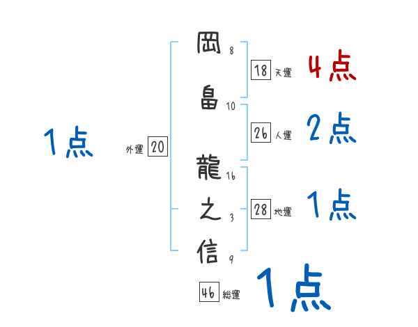 天運![]() | 岡畠龍之信さんの天運は18画の4つ星!情熱的で剛気。忍耐力があり信頼される。 家系が持つ宿命的な運勢を表します。祖先から受け継いだ苗字ですので自分の力が及びません。家柄を象徴します。 |