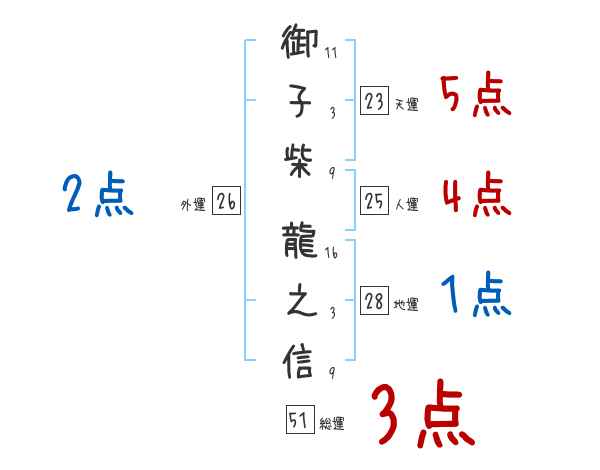 御子柴龍之信さんの画数の鑑定結果