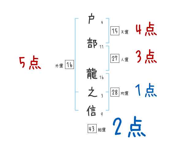 天運![]() | 戸部龍之信さんの天運は15画の4つ星!人徳があり出世する。順調に物事を進め円満な人生。 家系が持つ宿命的な運勢を表します。祖先から受け継いだ苗字ですので自分の力が及びません。家柄を象徴します。 |