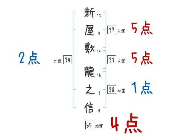 総運![]() | 新屋敷龍之信さんの総運は65画の4つ星!幸運に恵まれ繁栄する。包容力がある。 あなたの人生を表す1番重要な運勢です。生涯を通じて影響する総合運となり、主に50歳以降の晩年期に影響を及ぼします。 |