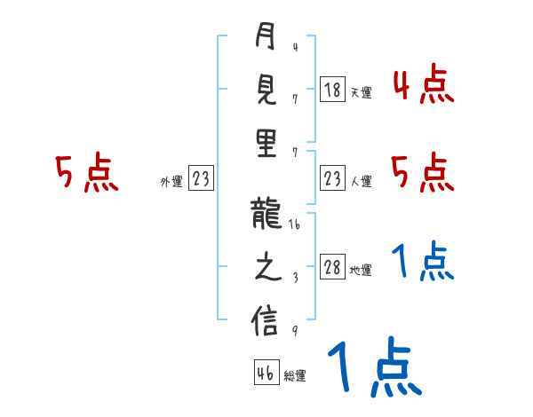 人運![]() | 月見里龍之信さんの人運は23画の5つ星!想像力に優れ活力がある。一代で成功し名誉を手に入れる。 性格や才能などを表す2番目に重要な運勢です。人間関係や協調性、社会的な成功に影響します。主に20歳から50歳ぐらいまでの中年期の運勢を表します。 |