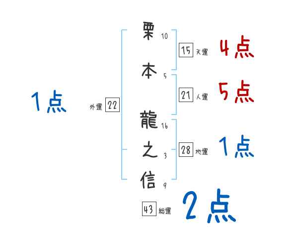 地運![]() | 栗本龍之信さんの地運は28画の1つ星!家庭環境に注意。スポーツで活躍できる能力があるかも。 個性を表す基礎的な運勢です。性格形成や対人関係、行動力など家庭環境に影響されます。主に誕生してから20歳くらいまでの若年期の運勢を表します。 |