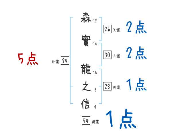 総運![]() | 森實龍之信さんの総運は54画の1つ星!トラブルが多いかも。周りをよく見て協調して過ごしましょう。 あなたの人生を表す1番重要な運勢です。生涯を通じて影響する総合運となり、主に50歳以降の晩年期に影響を及ぼします。 |