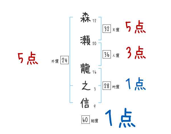 天運![]() | 森瀬龍之信さんの天運は32画の5つ星!柔軟性があり成功する。チャンスが多く金運が良い。 家系が持つ宿命的な運勢を表します。祖先から受け継いだ苗字ですので自分の力が及びません。家柄を象徴します。 |