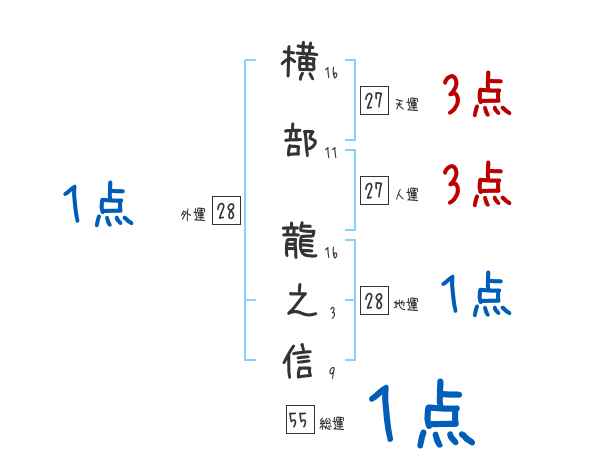 外運![]() | 横部龍之信さんの外運は28画の1つ星!家庭環境に注意。スポーツで活躍できる能力があるかも。 生活面を象徴する運勢です。外部から受ける影響力を表し、結婚運、家庭運や職場、環境への順応性を表します。 |
