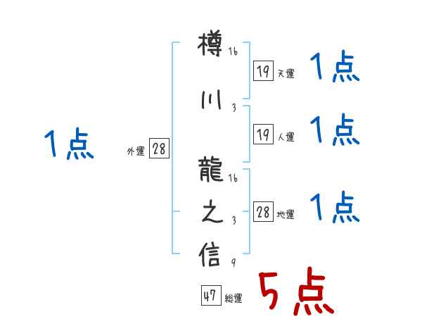 天運![]() | 樽川龍之信さんの天運は19画の1つ星!優れた才能を持ちますが、協調性が足りないことも。周りの人と協力する事を意識しましょう。 家系が持つ宿命的な運勢を表します。祖先から受け継いだ苗字ですので自分の力が及びません。家柄を象徴します。 |