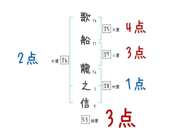 総運![]() | 歌船龍之信さんの総運は53画の3つ星!やや見栄っ張りで虚栄心がある。散財に注意。 あなたの人生を表す1番重要な運勢です。生涯を通じて影響する総合運となり、主に50歳以降の晩年期に影響を及ぼします。 |