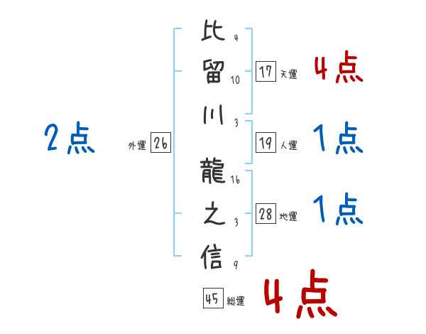 外運![]() | 比留川龍之信さんの外運は26画の2つ星!波瀾万丈かも。信頼できる人を大事にしましょう。 生活面を象徴する運勢です。外部から受ける影響力を表し、結婚運、家庭運や職場、環境への順応性を表します。 |