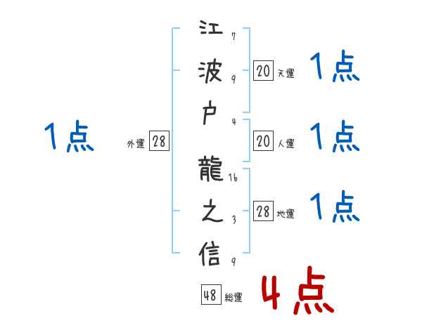 外運![]() | 江波戸龍之信さんの外運は28画の1つ星!家庭環境に注意。スポーツで活躍できる能力があるかも。 生活面を象徴する運勢です。外部から受ける影響力を表し、結婚運、家庭運や職場、環境への順応性を表します。 |