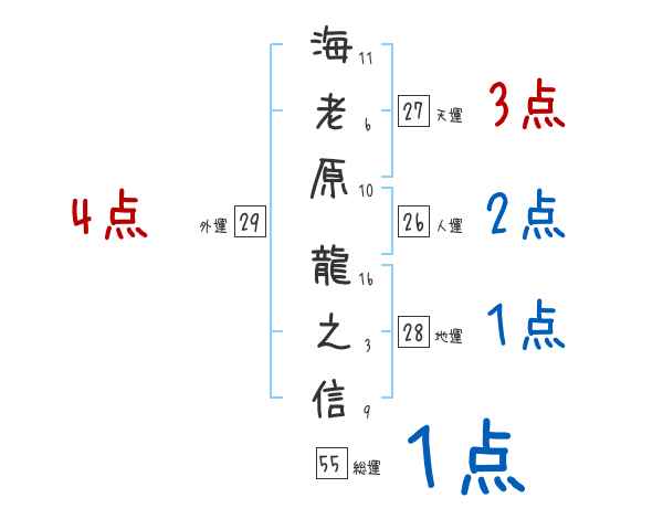 外運![]() | 海老原龍之信さんの外運は29画の4つ星!完全主義で才能がある。厳格な心の持ち主。 生活面を象徴する運勢です。外部から受ける影響力を表し、結婚運、家庭運や職場、環境への順応性を表します。 |