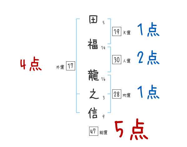総運![]() | 田福龍之信さんの総運は47画の5つ星!実力が開花し発展する円満な人生。財に恵まれる。 あなたの人生を表す1番重要な運勢です。生涯を通じて影響する総合運となり、主に50歳以降の晩年期に影響を及ぼします。 |