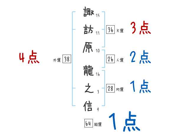 地運![]() | 諏訪原龍之信さんの地運は28画の1つ星!家庭環境に注意。スポーツで活躍できる能力があるかも。 個性を表す基礎的な運勢です。性格形成や対人関係、行動力など家庭環境に影響されます。主に誕生してから20歳くらいまでの若年期の運勢を表します。 |