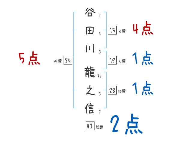 総運![]() | 谷田川龍之信さんの総運は43画の2つ星!頑固な性格で独立心が強いかも。やや非現実的で浪費に注意しましょう。 あなたの人生を表す1番重要な運勢です。生涯を通じて影響する総合運となり、主に50歳以降の晩年期に影響を及ぼします。 |