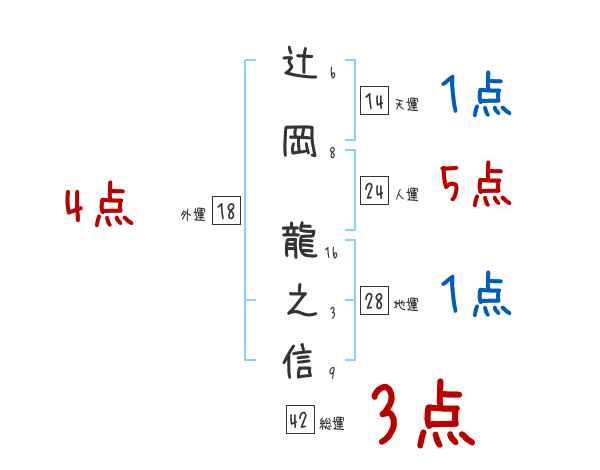 天運![]() | 辻岡龍之信さんの天運は14画の1つ星!人に対して優しいがストレスを溜め込みがち。人間関係のトラブルを避けるよう気をつけましょう。 家系が持つ宿命的な運勢を表します。祖先から受け継いだ苗字ですので自分の力が及びません。家柄を象徴します。 |
