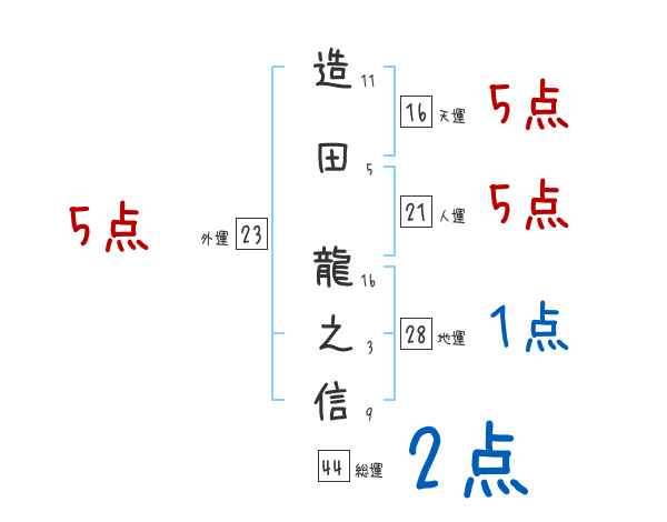 人運![]() | 造田龍之信さんの人運は21画の5つ星!統率力がある。独立し成功する。名誉を手に入れる。 性格や才能などを表す2番目に重要な運勢です。人間関係や協調性、社会的な成功に影響します。主に20歳から50歳ぐらいまでの中年期の運勢を表します。 |