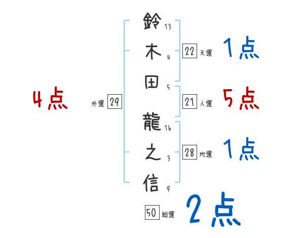 人運![]() | 鈴木田龍之信さんの人運は21画の5つ星!統率力がある。独立し成功する。名誉を手に入れる。 性格や才能などを表す2番目に重要な運勢です。人間関係や協調性、社会的な成功に影響します。主に20歳から50歳ぐらいまでの中年期の運勢を表します。 |