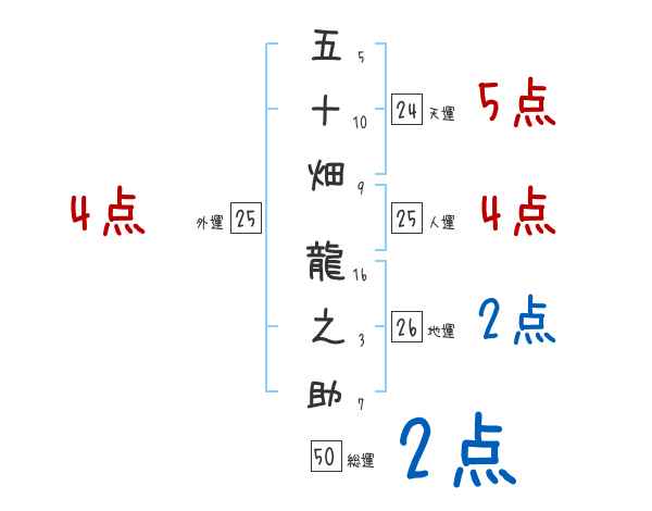 天運![]() | 五十畑龍之助さんの天運は24画の5つ星!家庭運が良く順調な人生。金運にも恵まれる。 家系が持つ宿命的な運勢を表します。祖先から受け継いだ苗字ですので自分の力が及びません。家柄を象徴します。 |