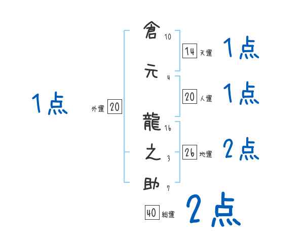 天運![]() | 倉元龍之助さんの天運は14画の1つ星!人に対して優しいがストレスを溜め込みがち。人間関係のトラブルを避けるよう気をつけましょう。 家系が持つ宿命的な運勢を表します。祖先から受け継いだ苗字ですので自分の力が及びません。家柄を象徴します。 |