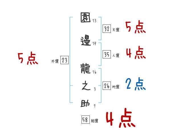 天運![]() | 園邊龍之助さんの天運は32画の5つ星!柔軟性があり成功する。チャンスが多く金運が良い。 家系が持つ宿命的な運勢を表します。祖先から受け継いだ苗字ですので自分の力が及びません。家柄を象徴します。 |
