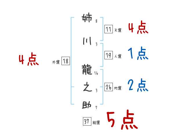 天運![]() | 姉川龍之助さんの天運は11画の4つ星!着実に富や地位を得る幸運な人生。 家系が持つ宿命的な運勢を表します。祖先から受け継いだ苗字ですので自分の力が及びません。家柄を象徴します。 |