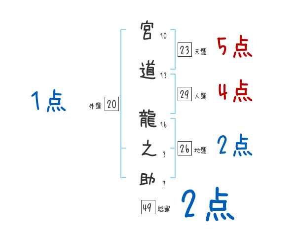 天運![]() | 宮道龍之助さんの天運は23画の5つ星!想像力に優れ活力がある。一代で成功し名誉を手に入れる。 家系が持つ宿命的な運勢を表します。祖先から受け継いだ苗字ですので自分の力が及びません。家柄を象徴します。 |