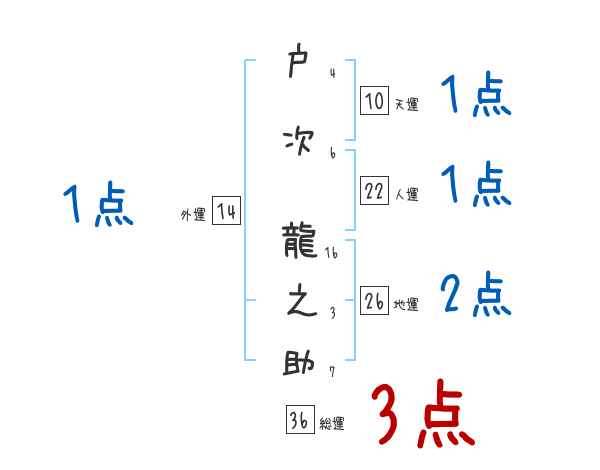 天運![]() | 戸次龍之助さんの天運は10画の1つ星!不安を感じやすい傾向。ストレスを抱えないように注意しましょう。 家系が持つ宿命的な運勢を表します。祖先から受け継いだ苗字ですので自分の力が及びません。家柄を象徴します。 |