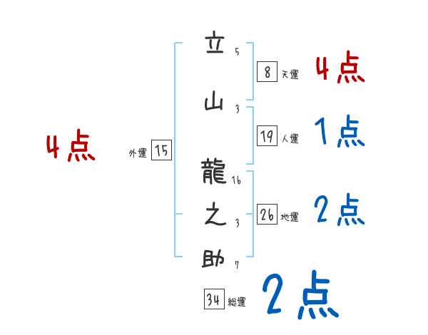 天運![]() | 立山龍之助さんの天運は8画の4つ星!勤勉家。根気強く努力し成功する。忍耐力がある。 家系が持つ宿命的な運勢を表します。祖先から受け継いだ苗字ですので自分の力が及びません。家柄を象徴します。 |