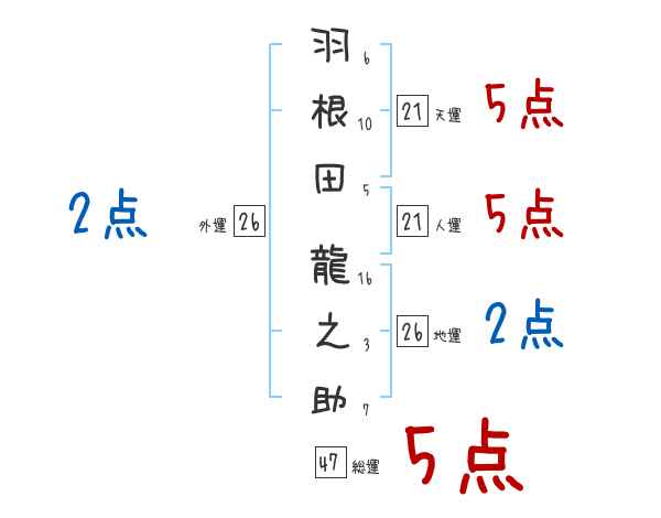 天運![]() | 羽根田龍之助さんの天運は21画の5つ星!統率力がある。独立し成功する。名誉を手に入れる。 家系が持つ宿命的な運勢を表します。祖先から受け継いだ苗字ですので自分の力が及びません。家柄を象徴します。 |