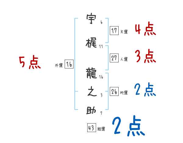 外運![]() | 宇梶龍之助さんの外運は16画の5つ星!人望が厚く大きく発展する。逆転成功が見える。 生活面を象徴する運勢です。外部から受ける影響力を表し、結婚運、家庭運や職場、環境への順応性を表します。 |