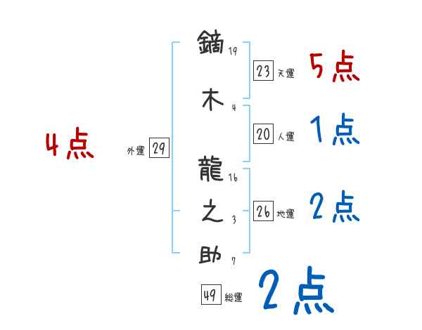外運![]() | 鏑木龍之助さんの外運は29画の4つ星!完全主義で才能がある。厳格な心の持ち主。 生活面を象徴する運勢です。外部から受ける影響力を表し、結婚運、家庭運や職場、環境への順応性を表します。 |