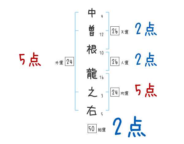 外運![]() | 中曽根龍之右さんの外運は24画の5つ星!家庭運が良く順調な人生。金運にも恵まれる。 生活面を象徴する運勢です。外部から受ける影響力を表し、結婚運、家庭運や職場、環境への順応性を表します。 |
