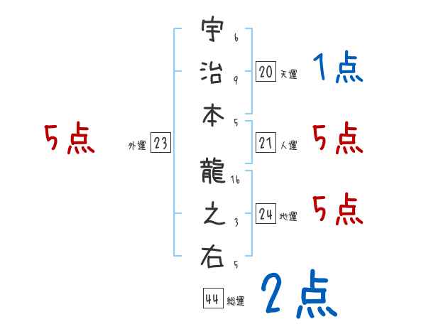 地運![]() | 宇治本龍之右さんの地運は24画の5つ星!家庭運が良く順調な人生。金運にも恵まれる。 個性を表す基礎的な運勢です。性格形成や対人関係、行動力など家庭環境に影響されます。主に誕生してから20歳くらいまでの若年期の運勢を表します。 |