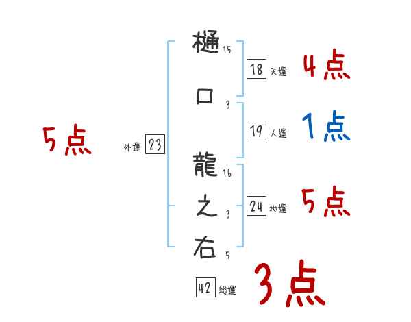外運![]() | 樋口龍之右さんの外運は23画の5つ星!想像力に優れ活力がある。一代で成功し名誉を手に入れる。 生活面を象徴する運勢です。外部から受ける影響力を表し、結婚運、家庭運や職場、環境への順応性を表します。 |